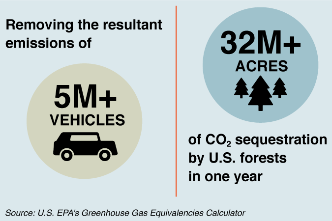 We have a carbon calculator method that shows customers just how much they can reduce greenhouse gas emissions by putting their shipments on rail instead of the highway. We compare the difference of carbons produced by rail vs. those produced by truck. It’s a lot of math and science, but the differences add up. Last year our customers managed to reduce their total carbon emissions by 24.7 million metric tons. That’s the equivalent of 5.3 million vehicles off the road annually.