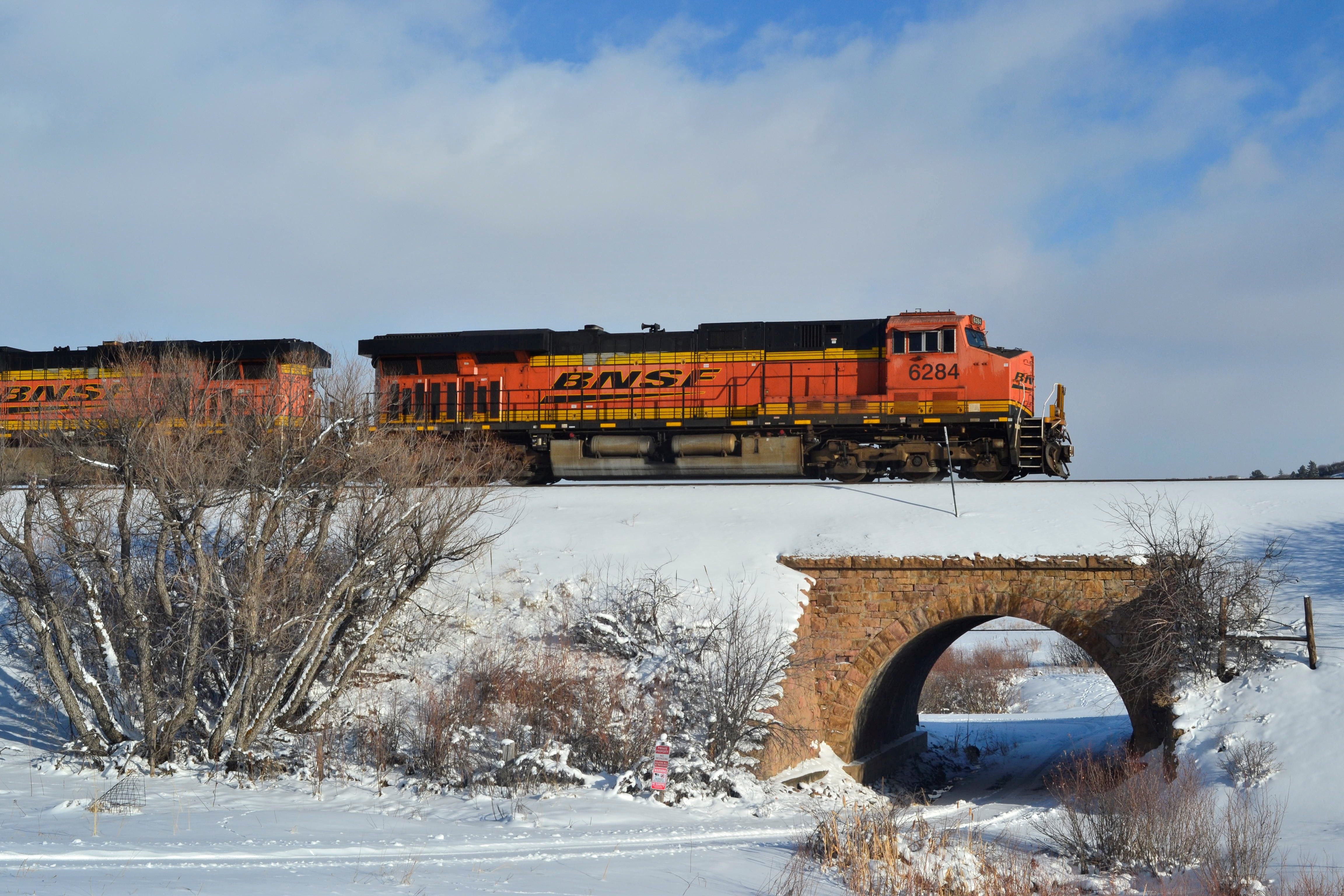BNSF 6284 passes through Spruce, Colorado, cutting through the snow-covered terrain with power and grace. We love the unique composition of the train moving over an overpass.