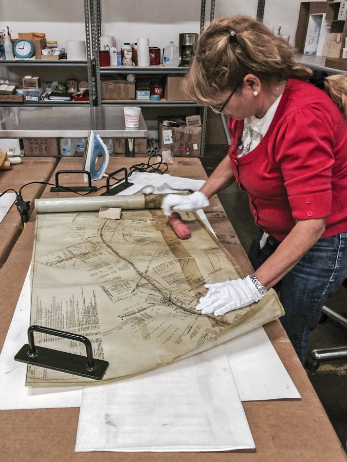 Because paper maps were a much-needed tool among railroaders, they were often exposed to field conditions: humidity, extreme temperatures, dust and dirt. Many -- some more than 20 feet long -- are fragile and tissue-thin, and had to be painstakingly restored. This included putting torn pieces back together like a puzzle. The preservation process included putting these fragile documents on acid-free paper to help ensure they are preserved as long as possible.