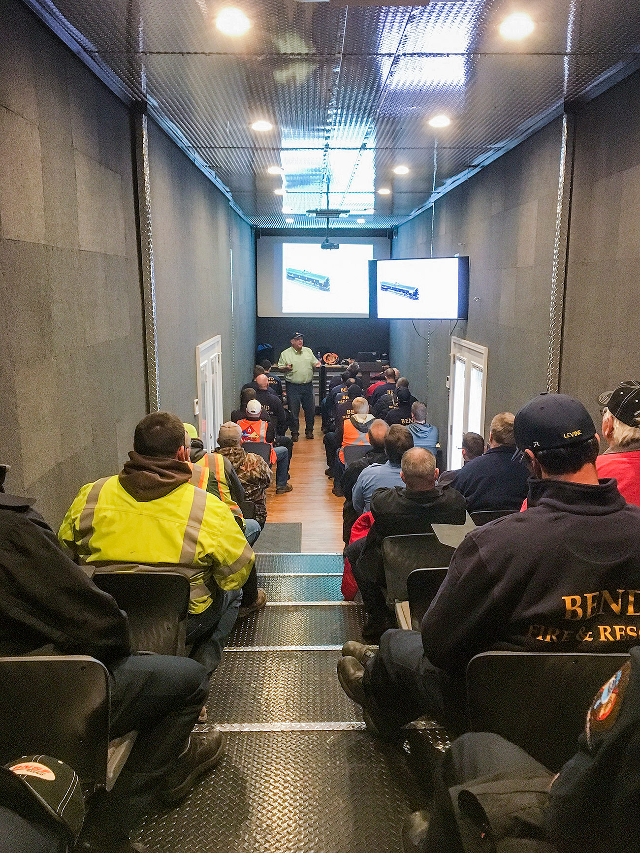 Visions of training may bring to mind a dry-erase board or a projected presentation. These classes aren't ordinary though, and neither is the classroom. In 2016, BNSF added a mobile classroom made out of a modified boxcar, so when the classroom rolls into town, trainees enter the car to theater-style seating for up to 37 people. Frequently, we need to conduct trainings at locations that either don't have a fire department training room or have a training room that is very far from a BNSF yard or siding where our training tank car is located.