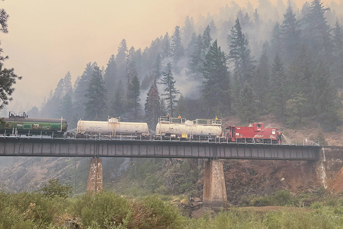 In the greatest at-risk areas, fire bladders – durable bags that can be filled with 10,000 gallons of water –and sprinkler systems are being deployed. Water and fire retardant are being sprayed, especially on bridges, to wet the crossties and structures to reduce the chance of them catching fire.