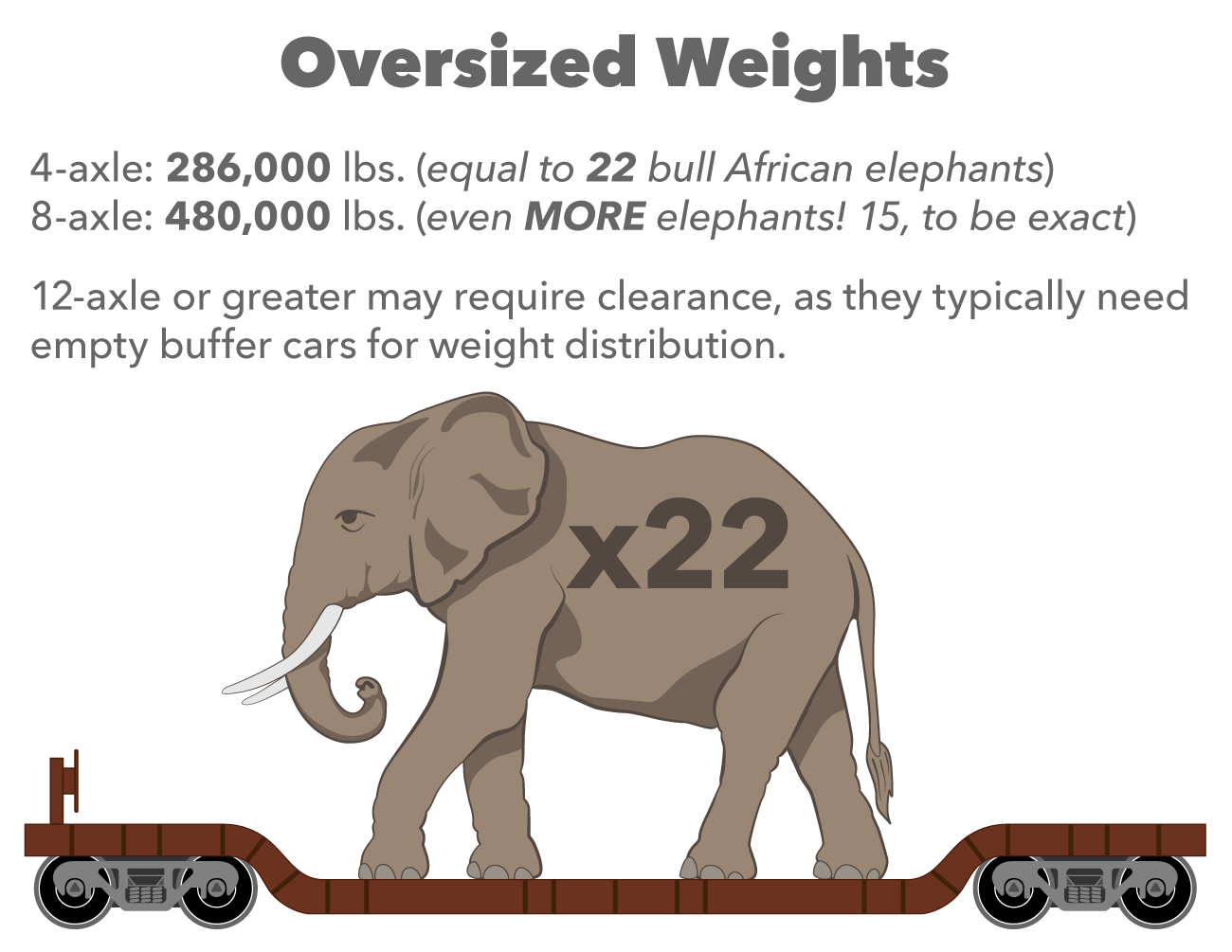 To put “big” into perspective, an oversized load is more than 17 feet tall from the top of the rail and more than 11 feet wide from the center of the railcar. Weight for a 4-axle car starts at 286,000 pounds – equal to about 22 bull African elephants.
