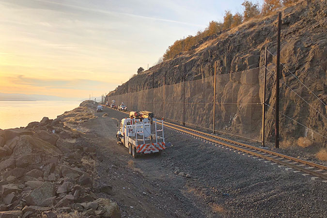 To protect our track from rockslides or falling rock, we install slide fences, a series of wires suspended by poles to form a fence. When debris breaks one of the wires, an electrical circuit is disrupted, and train operations are stopped until the track can be cleared.